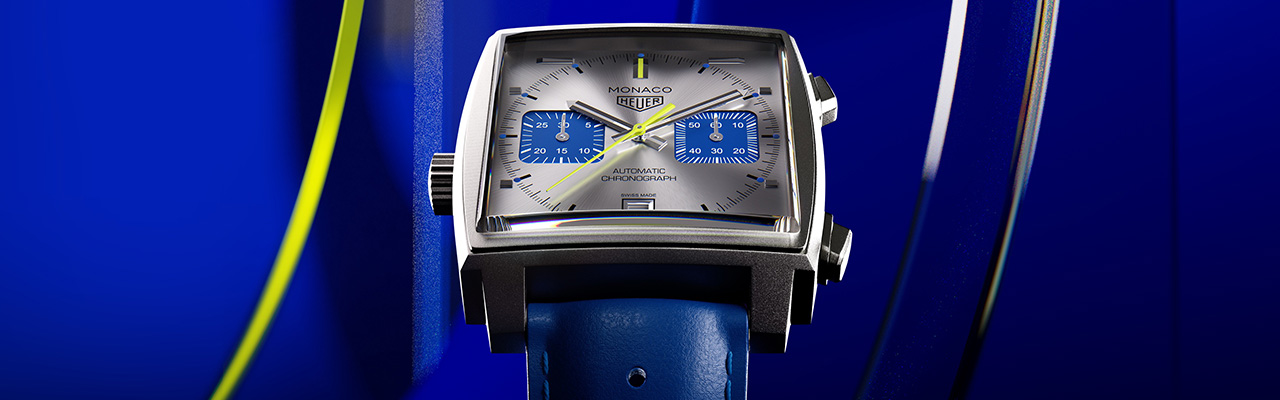 全新 TAG Heuer Monaco 計時腕錶賽車藍限量版搭載的色調,令人想起 Talbot-Lago、Delage 以及著名的 Bugatti Type 35 等夢幻傳奇賽車所採用的顏色。3點鐘與6點鐘位置的獨特方形小秒盤及計時盤與錶帶採用濃郁鮮明的湛藍色調,而時標則呈現較淡的水藍色。錶面以顯眼的萊姆黃點綴裝飾,不僅為腕錶增添一抹令人耳目一新的亮點元素,也讓錶款整體配色更臻完美。