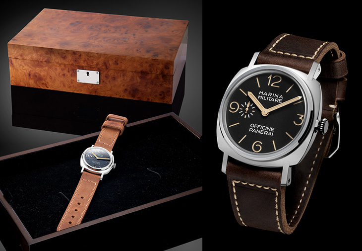腕錶的錶盒靈感源自歷史性的 Panerai 錶盒,外部為 Radica wood,內部托盤覆上黑色Alcantara,盒內設有內格收藏第二條復古錶帶。