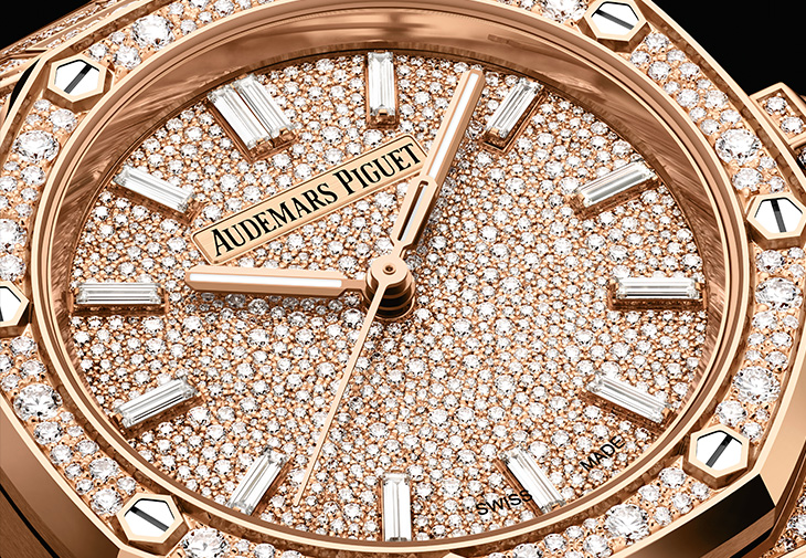 兩款18K白金新作採用單色調設計,玫瑰金錶款則展現雙色對比的精緻風貌。34毫米款式的錶面鑲滿879顆明亮式切割美鑽(總重約1.32克拉),37毫米新作的錶面綴滿699顆明亮式切割美鑽(總重約1.4克拉),閃耀晶瑩光采,與13根長方形鑽石時標相得益彰。18K白金或玫瑰金時分針都具有螢光塗層,在黑暗中依然醒目易讀。黑色愛彼標誌直接印在與錶殼及鏈帶同色的霧面打磨K金板上,盡顯系出名門的風範。