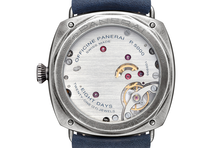 如今,新款的PAM01348也同樣 搭載八日鍊手動上鍊機芯,但是 P.5000機芯擁有更纖薄(4.5mm) 的機芯尺寸,所以新款的Radiomir Otto Giorni錶款配戴在手腕上,自 然不會太過厚重。但是P.5000機芯 擁有動力輸出更為均等的雙發條盒 結構,在長達八天的運轉過程中, 精準度自然更值得信賴。