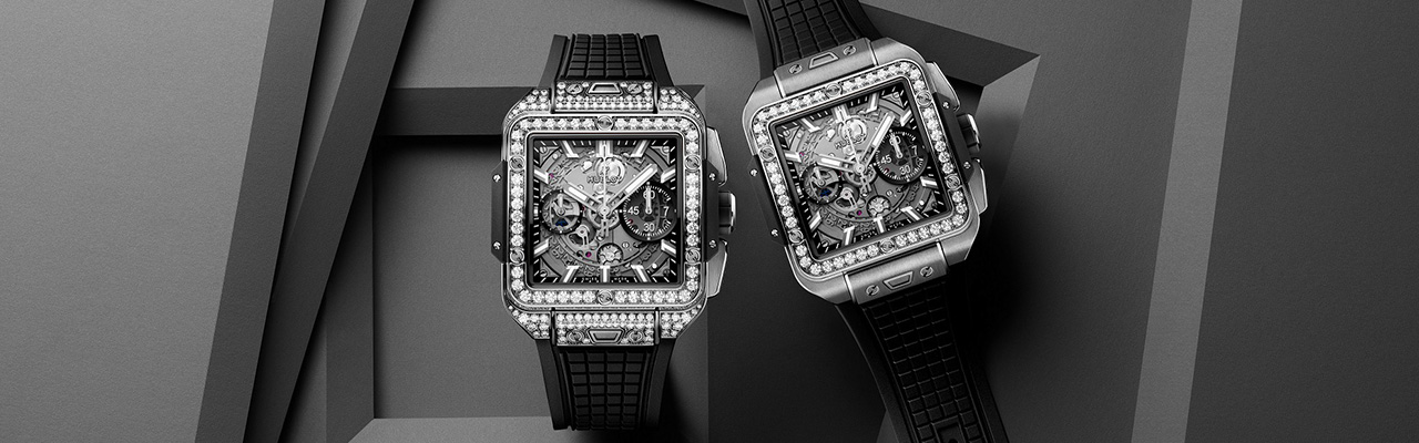 Square Bang Unico 鈦金款保留了極簡的科技感配色,在精緻打磨的砂灰色鈦金屬映襯下,多層次立體錶殼的精緻邊角細節處理,勾勒圓弧造型的滑順感,成就顯目的開闊視覺效果。Square Bang Unico 皇金款配色豐富,金質錶殼與黑色橡膠錶帶形成鮮明對比。Square Bang Unico 鑽錶系列將前衛的運動風外型,增添了前所未有的奢華感,不僅能勾勒腕錶的立體輪廓,進而呈現更鮮明的多層次方型線條,憑藉鑽石璀璨奪目的光芒,營造前所未有的強大自信氣場。