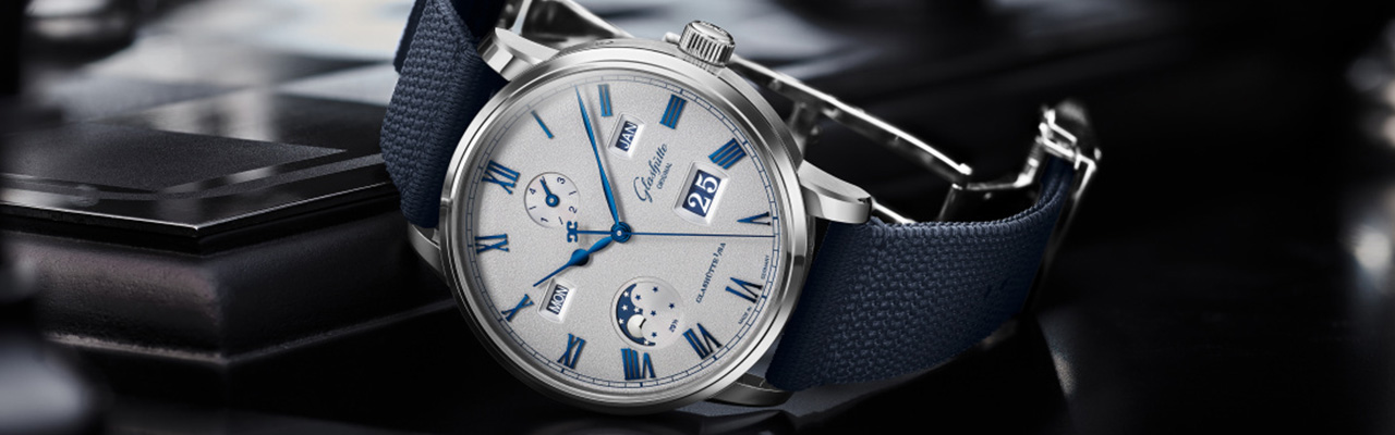 將格拉蘇蒂原創的兩項經典功能集於一體:一輪手工精製的銀色或金色圓月在拱形月相盤中循跡而行。透過細緻的鑽石銑削工藝打造出銳利分明的輪廓,在電鍍藍色夜空的襯托下閃爍熠熠光輝。格拉蘇蒂原始代表性的大日曆顯示位於4點鐘位置,由兩個設在同一水平面上的日期顯示盤組成,中間未設分割線,一目了然,清晰易辨。
