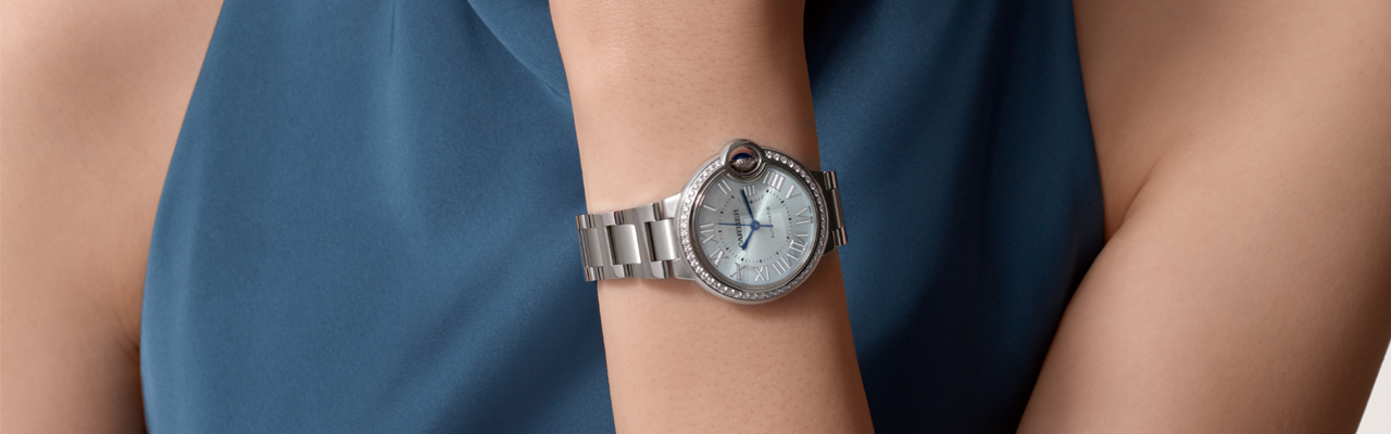 Ballon Bleu de Cartier最獨特的 設計就是具備似圓非圓的錶殼結 構,有別於一般圓形錶款,其正面 和背面都呈現渾圓的弧形,讓整只 錶如同一枚鵝卵石般,具有流線型 的3D立體感,配戴上手時就仿似 一只懸浮的熱氣球。再者,腕錶使 用「圓中帶圓」的錶殼設計,在錶 殼3點位置設計有與整個錶殼連成一體的錶冠護橋,當中保護一枚鑲有凸圓形藍寶石的球型錶冠,這不僅讓整只腕錶在視覺上呈現出些微的不規則感,在整體渾圓的造型基礎上卻依然和諧美觀、連結藍氣球的設計概念,也帶來充分的歷史感和趣味性,讓這款腕錶具備極高的辨識度。今年品牌為系列打造的全新鑲鑽面盤設計,自然也以此經典造型去做發揮。