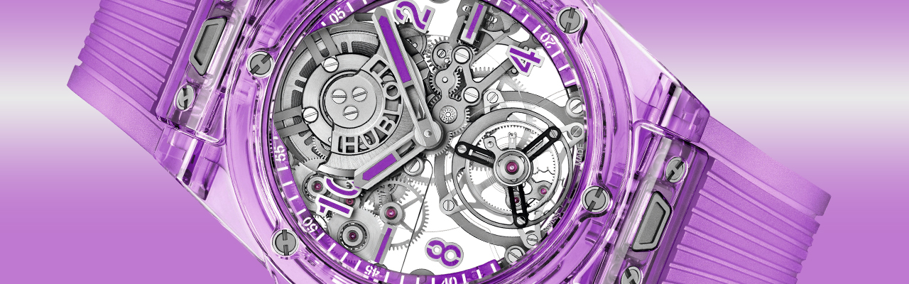 材質魔術師宇舶HUBLOT向來熱於挑戰各種創新材質與製作技術,打造風格獨特的錶款。其中通透的藍寶石錶殼絕對獨步江湖, 不只突破技術限制製作複雜殼型,還固定推出嶄新色澤,說明對材質的掌控實力。