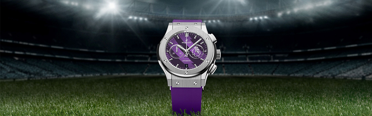 稱霸足球運動領域的HUBLOT宇舶錶,為全球足壇最頂級聯賽-英格蘭超級足球聯賽(Premier League,簡稱英超)打造經典融合英超計時碼錶,是第一只見證賽事光榮時刻的機械錶。緞面拋光的42毫米鈦金屬錶殼,紫色放射狀面盤和錶帶,象徵英超的地位與榮耀。面盤與錶背均有傲氣雄獅的英超標誌,整只腕錶英姿煥發,展現磅礴的高級運動腕錶氣勢 ,全球限量100只 !