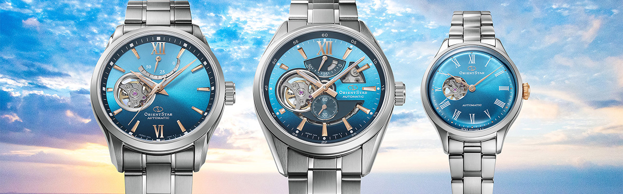 ORIENT STAR東方之星推出一系列以連接世界的天空和海洋顏色為靈感的限量版手錶。該系列包含三個新型號,分別是來自現代系列的Modern Skeleton(RE-AV0122L)和Semi Skeleton(RE-AT0017L),以及來自經典系列錶面較小的Classic Semi Skeleton(RE-ND0019L)。三款手錶在錶殼背面皆刻有限量版序號,並且配有能夠令人聯想到早晨陽光下被照亮的海洋與天空的生動藍色錶盤。