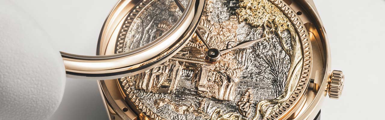 Les Cabinotiers閣樓工匠 – Memorable places腕錶的錶盤展現了融匯多種雕刻工藝的全新匠藝,其中兩枚還結合了金銀鑲嵌工藝,精心描繪四處歷史遺跡的勝景風貌。每一枚錶盤均覆以黃金、白金及粉紅金薄片,並置、組合以展現畫面中不同色彩的區域,或層疊覆蓋以營造出視覺縱深感。金質薄片組裝之前,均先經由微雕和線雕工藝製作畫面成像,手工雕刻大師需要在厚度僅有0.4至0.8毫米的薄片上進行雕刻作業,雕刻深度必須控制在0.1至0.2毫米以內,極限挑戰般的過程對工匠工藝水準要求極高,每一枚錶盤的製作均至少需要200小時起。
