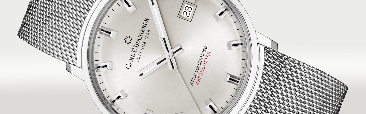 致敬經典,回歸簡約,寶齊萊CARL F. BUCHERER為紀念品牌成立135週年而推出限量版的復刻時計傳承系列瑞士官方天文台認證腕錶。腕錶展現了1960年代前身作品的設計精髓,避免了過多的裝飾,強調實用而低調的設計美學。因此,新款版本在面盤上設計簡練,除了日期和指針、時標外,並無其他圖案裝飾。不過整只腕錶仍可感受到細膩的製作巧思,比如帶有弧度的鏡面輪廓,搭配腕錶纖薄的身型輕巧又精緻。設計成斜邊造型的時標為盤面視覺帶來立體感,秒針也在尾端部分裝飾紅色三角形,讓讀時更直覺。錶款搭載通過瑞士天文台C.O.S.C.認證的CFB 1965.1自動機芯,面盤6點處有標示字樣。