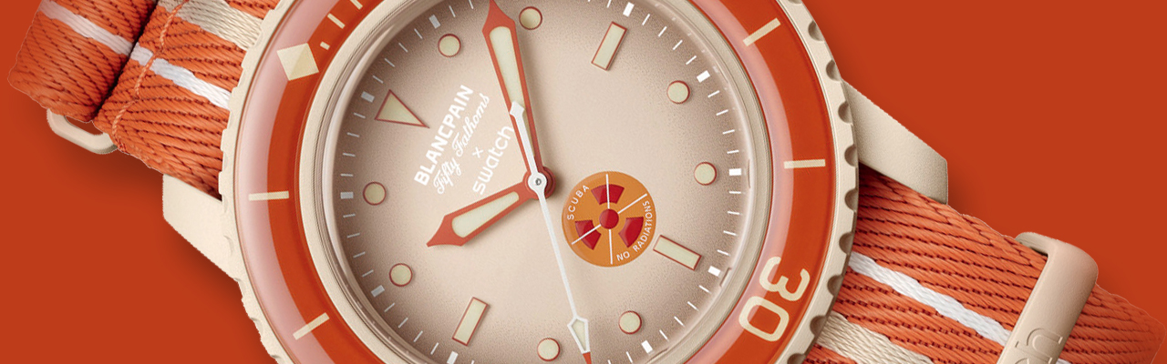 繼MoonSwatch在錶壇吹起一陣炫風後,SWATCH選擇與寶珀BLANCPAIN合作打造下一只聯名款腕錶。Bioceramic Scuba Fifty Fathoms的設計原型是在1953年問世,作為世界首款真正專業潛水錶的Fifty Fathoms五十噚。腕錶外觀以多處設計連結Fifty Fathoms過去款式,特別設置91米防水性能,91米正等同於50噚海事深度測量單位,也是另一項對其的致意。系列共推出五款腕錶,分別以地球的五大洋命名,所有款式均採用品牌研發的專利材質Bioceramic生物陶瓷製作錶殼,錶殼側面刻有SWATCH字樣,如同原版慣例。腕錶內部則搭載品牌第一款也是唯一一款全自動化生產的機械機芯Sistem 51,採Nivachron ™游絲並搭載形似透明圓盤的環形自動盤。