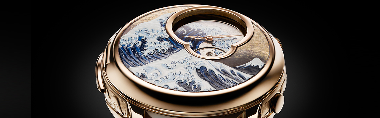 眾所周知,Logical One可說是品牌真正揚名立萬的作品,獨特又細緻的水平橫定動力芝麻鍊結構將品牌精湛的機械結構展露無遺,一直受到許多藏家喜好。但因為製作耗時耗力,考量到品牌整體發展前幾年便宣布停產,僅接受特殊訂製。此款浮世繪便是。錶款以應該是現今最具代表的浮世繪圖—由浮世繪大師葛飾北齋繪製的《神奈川衝浪裏》為題,將錶蓋與下層的偏心面盤串連為一張畫布,透過金雕、彩繪琺瑯打造充滿層次感的圖案。按壓錶側按鈕打開錶蓋,錶蓋底部更繪製了百工街景圖,彷彿在訴說一個由遠而近的故事。此外,錶殼側身也有精雕波浪圖繪,讓錶款的藝術性再上一層。