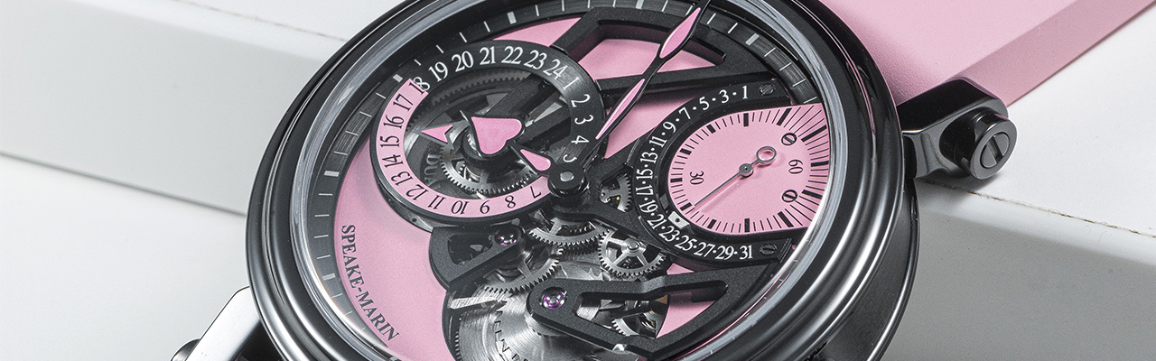 由新團隊接手後,SPEAKE MARIN時彼克在保有原來的設計元素前提下,添入不同的活潑概念。此款One & Two Dual Time Pink鏤空雙時區逆跳日期腕錶粉紅版便以十足亮眼的粉紅色為主調,橡膠錶帶、面盤、指針都採用Pantone色號700C的粉紅色,結合黑色DLC處理的鈦金屬錶殼,撞色加上立體面盤配置,讓整體風格更強烈。