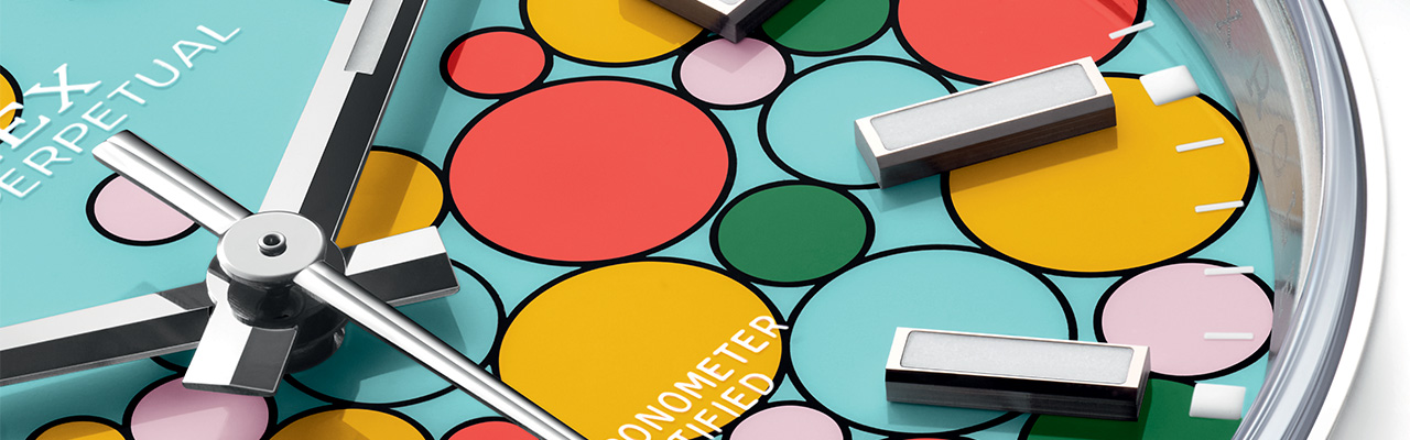 勞力士ROLEX在2023年推出使用多色彩氣泡圖案的Oyster Perpetual錶款,這是鮮少出現在勞力士錶款的設計,同時營造出亮麗繽紛的微型世界。