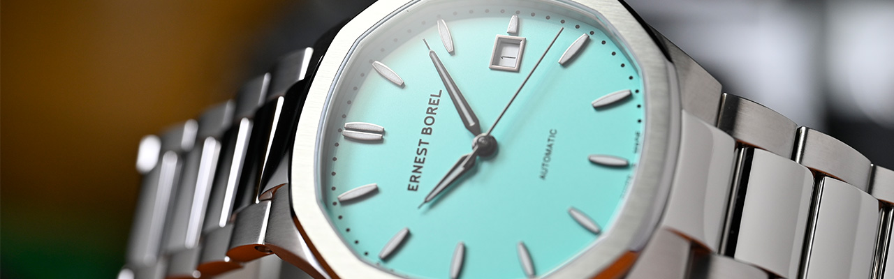 以風靡全球的土耳其藍色不僅時尚搶眼,材質上更採用溫潤光亮琺瑯質感的搪瓷油塗裝(Ceramic Oil),融入八角形錶殼的鮮明設計風格,獨特的視覺效果給人溫暖、復古、新奇感受,時間就在這低調奢華又優雅的氛圍中渡過。其中,別於品牌既有的雙人舞商標,取而代之的只有英文字母「Ernest Borel」,完美體現俐落簡潔的新時尚設計。
