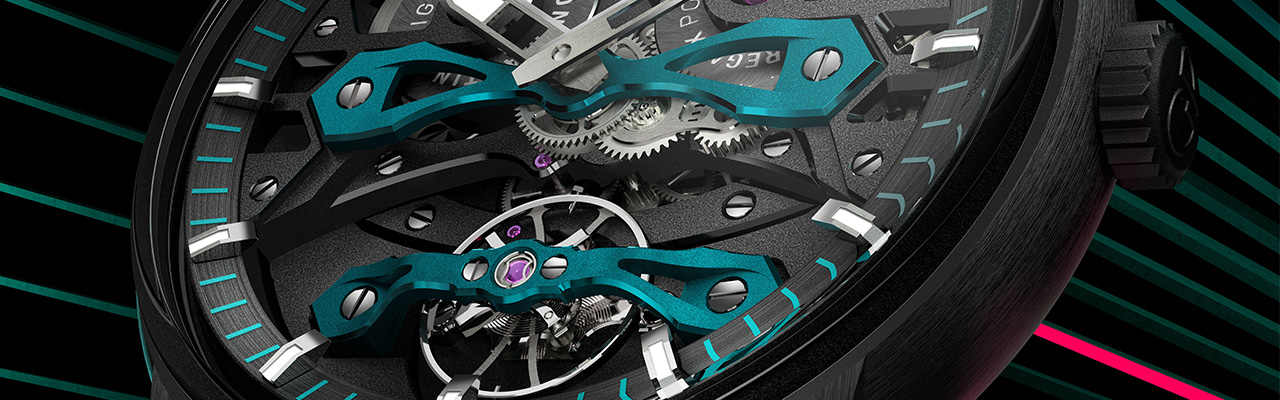 為了呼應汽車領域免去不必要材料以減輕重量的作法,此錶捨棄了傳統面盤,以機芯顯露於外的鏤空方式呈現,搭配質輕的鈦金屬錶殼,便打造出輕盈的配戴手感。
