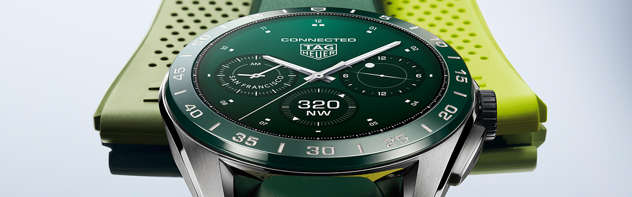 本次推出的綠色款優雅時計,在 TAG Heuer Connected Calibre E4 智能腕錶45毫米系列現有的 黑色與藍色款式中再添新成員,增加選擇性, 以滿足不同品味與喜好的需求。