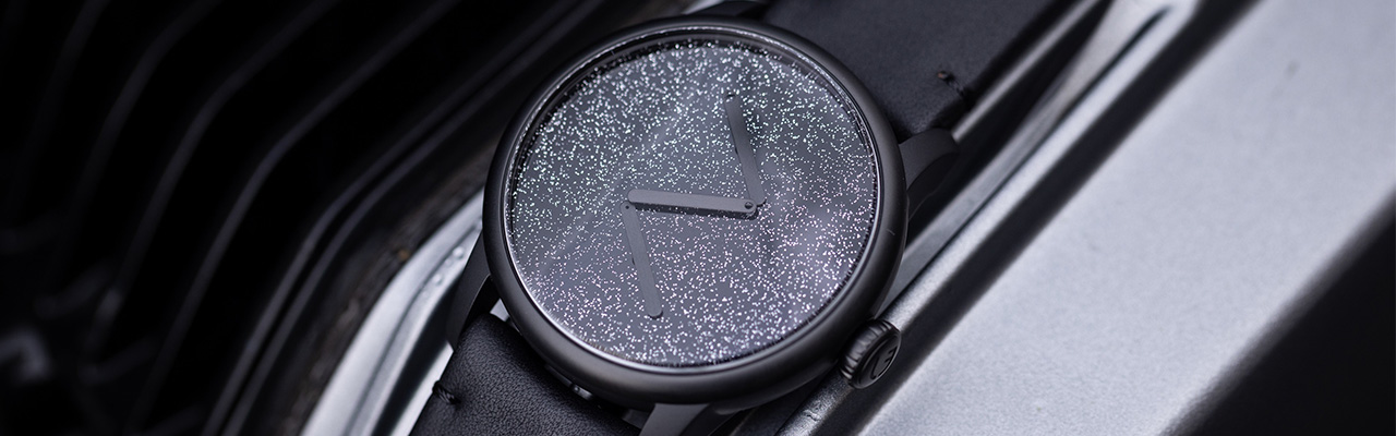 第一眼所見,Le Régulateur LOUIS ERARD x Olivier Mosset通體漆黑,錶殼、面盤、指針、錶帶都是,沒有任何品牌標誌、沒有時標,只有黑色面盤上閃著的銀色光點形成鮮明的對比,概念上這依舊是純粹的藝術,但又想表現更多。呈三針一線排列的棒狀時、分、秒針,每個指針有著相同的長度、寬度以及邊角修飾。僅在指針的某側端點開一個風格簡潔的細微小孔。以此讓棒狀指針左右不同,進而形成依據,讓佩戴者不被混淆,能以此判斷指針指示的時間。