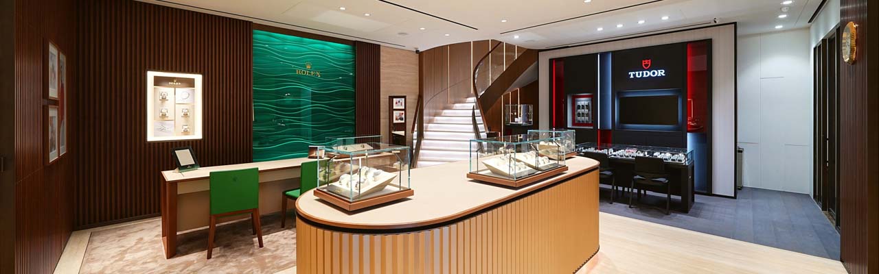 其中佔據外牆面積的三大品牌ROLEX勞力士、TUDOR帝舵表與PATEK PHILIPPE百達翡麗,則是位於店內一、二樓層的主要品牌,但是過去彙集各大頂級品牌的二樓,此次則完全屬於百達翡麗與總經理辦公室的空間。透過打通二、三樓層的設計,營造出奢華的氣勢,店內空間則以天然大理石材為主輔以沉穩的實木材質。