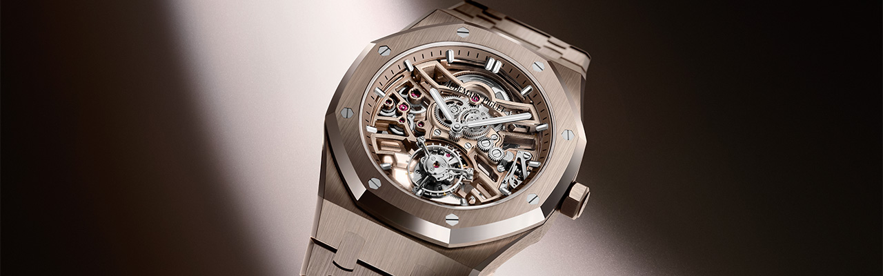 沙金色調夾板和主機板與灰色細節形成對比。銠色調發條盒、輪系和設於6點鐘位置的飛行陀飛輪,呼應著螢光塗層白金時標與指針。12點鐘位置的黑色愛彼標誌直接印在經防炫光處理藍寶石水晶玻璃鏡面上,讓機芯的鏤空架構取代傳統意義上的錶面。從腕錶背面還可鑑賞銠色調22K玫瑰金自動盤,整體一致的雙色設計盡善盡美。