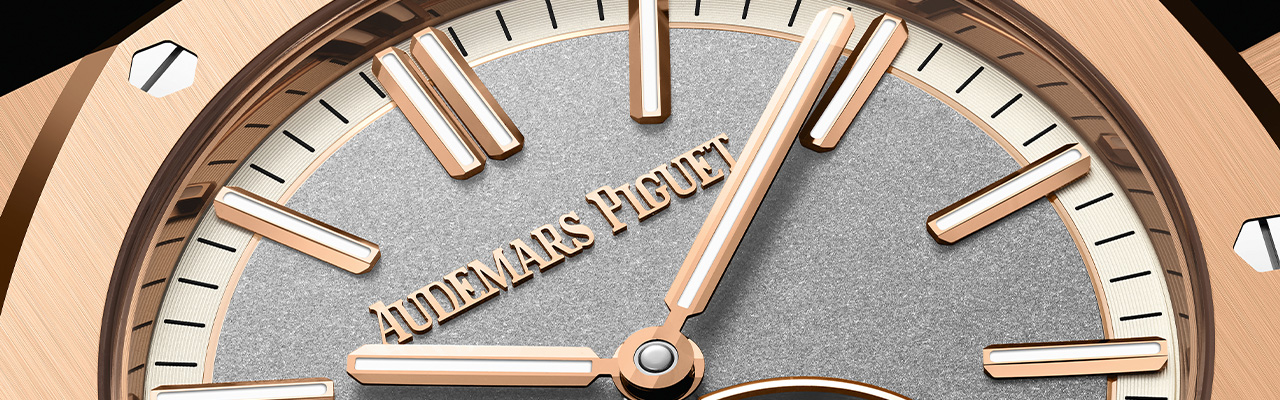 12點鐘位置的金色或銠色調K金立體愛彼標誌採用電鍍生成法(類似3D列印)製作而成,在錶面上引人矚目。K金立體刻面時標與Royal Oak皇家橡樹指針內填螢光材料,即便在黑暗中依然醒目易讀。