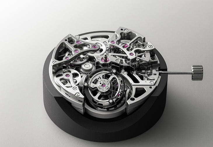 首先說6點位置的是更精練的雙軸陀飛輪,一改MP-09相對粗壯的框架,讓陀飛輪的視覺更輕巧,與充滿高度機械風格的鏤空面盤更有一致性,賞玩性更佳。而MP-09所採用的雙軸陀飛輪主要連動轉軸位在12點位置,而MP-13則因為逆跳時分指針的結構而改到在10點位置(不知是否巧合,這樣的佈局正好呼應位於10點位置的動力儲存指示)。這樣的配置,也能更好的欣賞雙軸陀飛輪360度的運作姿態。