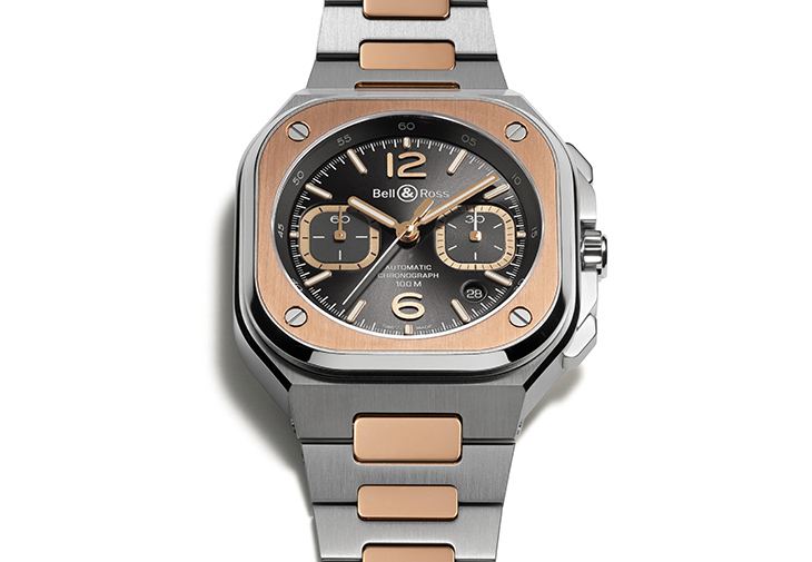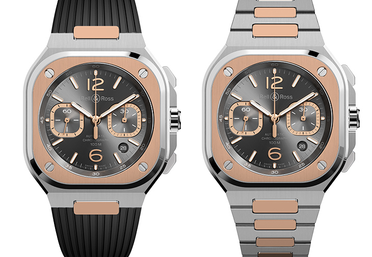 Bell & Ross品牌的鮮明個性體現於腕錶設計美學,全新BR 05 Grey Steel & Gold的特色自然是雙色雙金屬組合,防水100米的42毫米鋼錶殼經磨砂及拋光打磨,烘托建築線條美,配上18K玫瑰金錶圈及中央鏈節,鍍釕錶盤光感亮麗,3時位置為分鐘計時器,9時位是小秒針盤,4時半位置設有日曆窗。