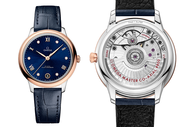 腕錶搭配舒適時尚的深藍皮革錶帶,抗磨損藍寶石水晶錶背展現歐米茄8800同軸擒縱大師天文台認證機芯的美態。