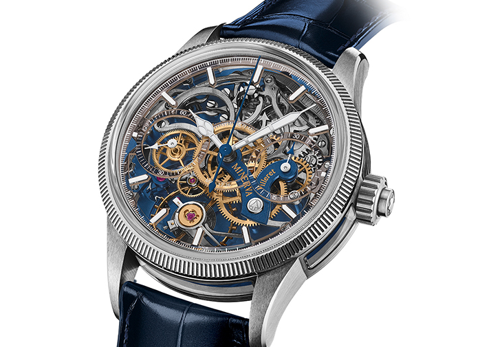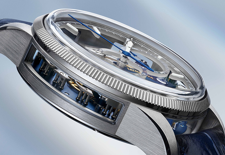 為更深入欣賞機芯各個元件的精湛工藝,MB M17.26機芯的計時複雜功能以柱狀結構支撐,透過光線透射照亮機芯。計時錶橋也放置在機芯頂部,以突出這個獨特的元件,而這個特別設計也於1912年獲得專利。此外,德國銀夾板與錶橋均採用了時尚的藍色,與機芯的其他部分形成鮮明對比,同時與藍色暈染小牛皮錶帶的色調相配,增添現代感。