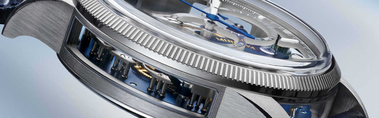 此腕錶配備43毫米精鋼錶殼,表面經過優雅的橫向緞面刷紋處理,並搭配白金凹槽紋錶圈,靈感來自Minerva於1927年推出的首款凹槽紋錶圈,使腕錶更顯尊貴高雅。