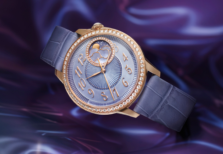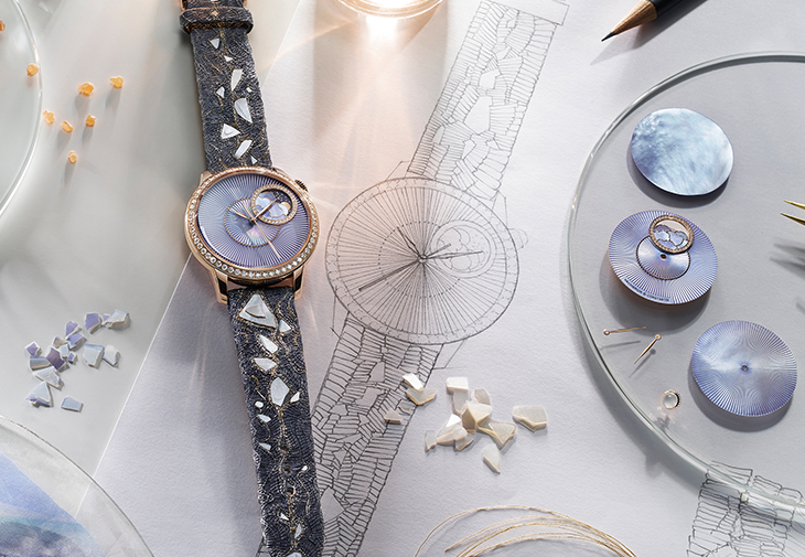 錶盤上未設時標,而是以直觀感性的方式,呈現時間的倏然流轉。細膩的褶皺紋飾在珍珠貝母材質錶盤上錯落鋪開。錶盤中央的紋飾周圍環繞一圈精緻的金質珠粒;外圈部分則呈現連貫起伏的紋理效果。錶盤採用殷亦晴精心挑選的淡雅丁香紫配色,「柔美而缥缈,宛如一場轉瞬即逝的白日幻夢」。由珍珠貝母精雕而成的月相顯示盤同樣以丁香紫色呈現。在璀璨鑽石的環繞下,這一複雜功能更顯矚目。纖細的時針、分針和秒針優雅掃過盤面。
