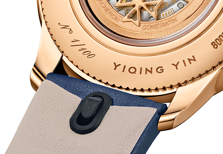 與這一標誌性的高級鐘錶裝飾細節相呼應,殷亦晴的姓名刻紋精心鐫刻於錶 背,旁邊點綴此款限量僅100枚的腕錶傑作的獨立編號。