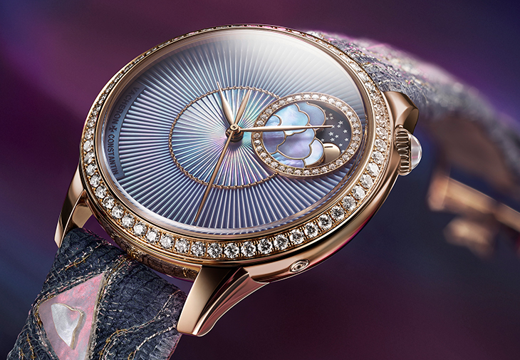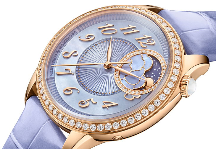 以高級訂製時裝的精緻格調和江詩丹頓的製錶美學傳承為靈感,Égérie系列 亦另推出一款限量僅100枚的月相腕錶新作,同樣與殷亦晴連袂設計而成。腕錶配備三條可快速替換錶帶,採用直徑37毫米的粉紅金錶殼搭配鑲鑽錶圈和精緻的丁香紫色調錶盤。新作延續了該系列的美學特質,珍珠貝母錶盤交替 呈現光面質感與褶皺紋飾,月相顯示盤巧妙呈於江詩丹頓品牌標識與錶冠之 間構成的一條似有若無的對角線上。