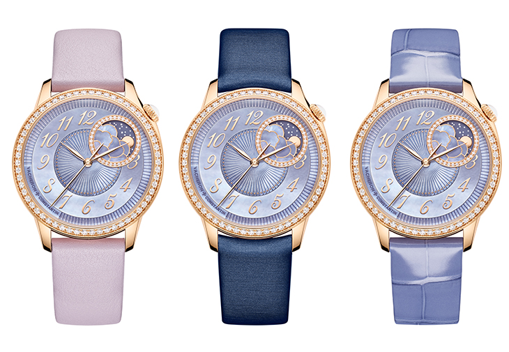 得益於該系列自問世以來巧妙採用的可快速替換錶帶設計,全新Égérie系列月相腕錶展現出靈動多變的魅力。腕錶配備與錶盤優雅配色相呼應的丁香紫色鱷魚皮錶帶,以及夜空藍缎面效果小牛皮和粉紅色粒面小牛皮錶帶。佩戴者可輕鬆更換錶帶,以不同的材質賦予腕錶魅力。