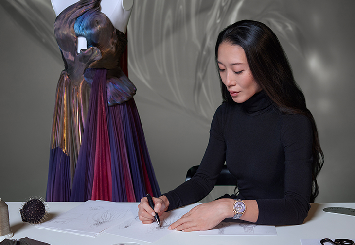 此次,為搭配全新Égérie系列概念腕錶,殷亦晴還特意設計了一款高級訂製禮服,與腕錶美學構思一脈相承。「輕盈的面料環繞著身體飄揚展開,呈現出褶皺細節和夢幻般的色彩,令人聯想到錶盤上的細膩紋理折射出的光澤。這一貼合身形起伏的廓形,營造出懸浮於時光之間的柔韌感,隨著穿著者的動作和與外界的互動,展現出輕靈質感。太陽射線般的褶襚線條浮現於靈動裙擺之上,層層鋪開的虹彩缎面與絲綢雪紡交疊出剔透的視覺效果,捕捉每一個瞬間的流麗絲光。這一創作以大自然的蓬勃活力為靈感,讚頌動態之美,於流暢優雅的設計中彰顯無限可能。」
