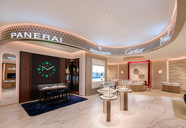 全新落成的TimeVallée時光天地板橋大遠百專賣店,為造訪於此的尊客,打造身歷其境、匠心獨具且量身打造的奢華購物體驗,店內複合式展示空間,精心呈現六大高級品牌的共通代表元素,例如精緻雋永的金色橫招,從門面一直延伸到店內,讓人不禁連想到高級腕錶的貴金屬鍊帶,搭配每個品牌獨樹一幟的展示櫃位,再加上寬敞大器的開放式空間,讓人不由得駐足流連其中,細細感受每件珍貴作品的獨特魅力。店內專業鐘錶珠寶銷售顧問一字排開,引領品牌粉絲、鐘錶同好與專業收藏家,共同進入極致迷人的鐘錶珠寶世界,重新定義高級製錶與頂級珠寶銷售模式。