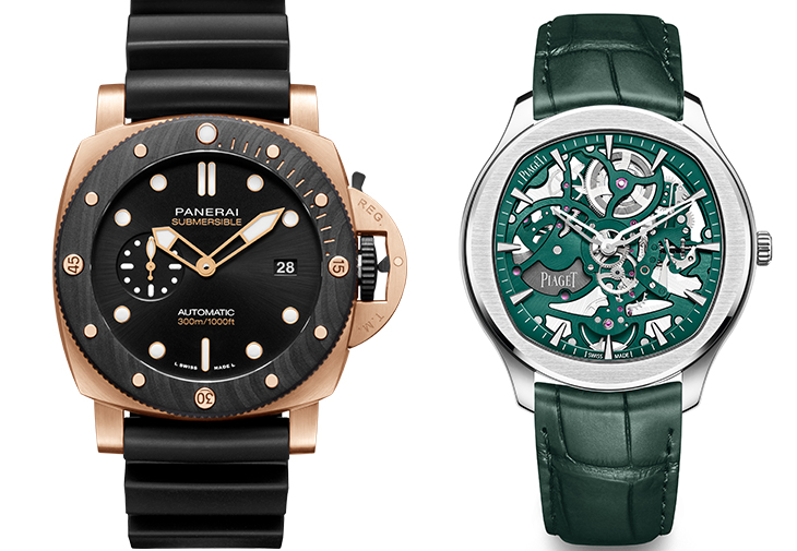 PANERAI沛納海Submersible 44毫米紅金碳纖維潛水錶,將品牌特有兩大創新材質完美結合,44毫米Goldtech™紅金錶殼,色澤更顯濃郁,且不易氧化;Carbotech™碳纖維交織出錶圈、錶冠和錶冠護橋鎖桿等功能性組件,適用於各種極端環境,此外,錶面以太陽放射紋潤飾,乃此系列罕見的細節處理,時針、分針、棒狀及圓點時標,皆以藍/綠色夜光顯示,在水下也能清晰讀時,搭配防水300米實力,可謂集耐用與精準等可靠性於一身;擁有150年豐富歷史的瑞士頂級珠寶暨腕錶世家PIAGET伯爵,其PIAGET Polo系列孔雀綠鏤空超薄精鋼腕錶,搭載自製1200S1超薄自動上鍊機芯,採用近年來極為流行的綠色,象徵源自大自然無限生機,同時向品牌製錶工坊所在地侏羅山仙子坡的山林美景致敬,銀色時標、鏤空指針,再加上孔雀綠鏤空錶盤與岩灰色自動盤,每個細節皆娓娓傳遞伯爵在設計美學、機芯工藝及製錶傳統的魅力神髓。