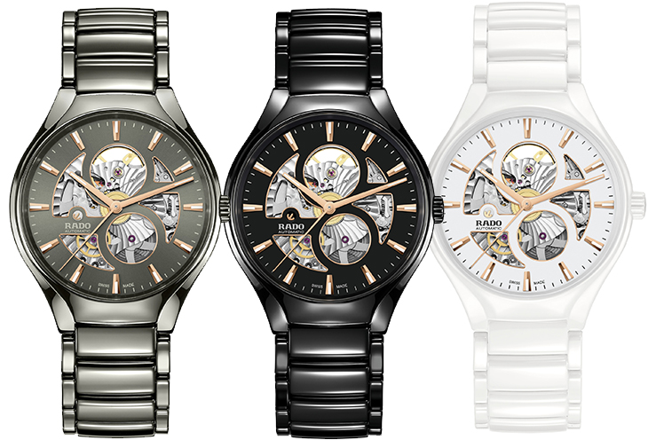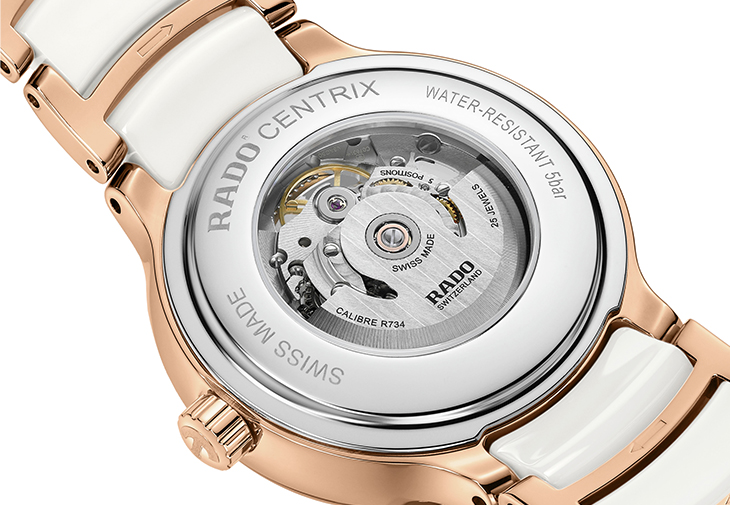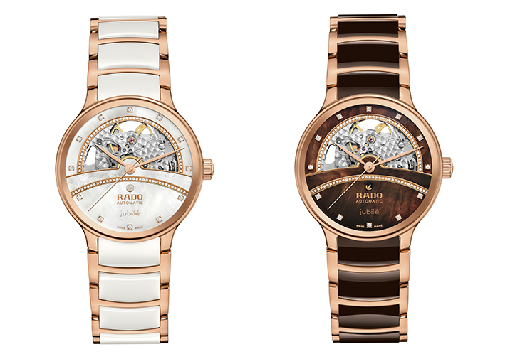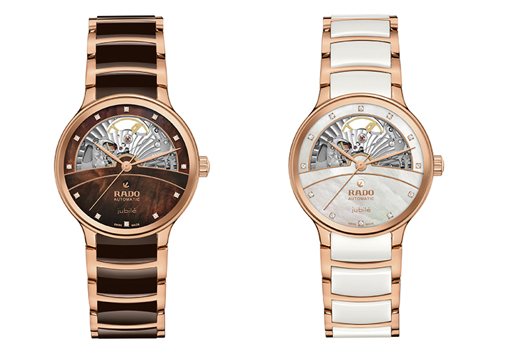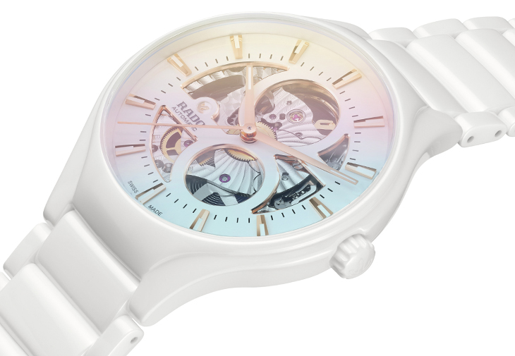 該系列推出不同色系的陶瓷款式以供選擇,輕盈、明亮、飄逸的錶款選用白色珍珠母貝錶盤,搭配白色高科技陶瓷錶鏈中央鏈節。另一款對比鮮明、強烈的錶款,則採用深棕色珍珠母貝錶盤搭配棕色高科技陶瓷錶鏈鏈節,並經過PVD處理,同樣濃烈的玫瑰金色精鋼錶殼與錶鏈外部鏈節。錶殼覆有雙面防反光塗層,賦予完美可讀性。不鏽鋼底蓋採用另一塊藍寶石水晶玻璃,不只彰顯這款 Rado 瑞士雷達表「鏤空藝術」,也讓配戴者一覽製錶工藝美學。