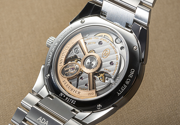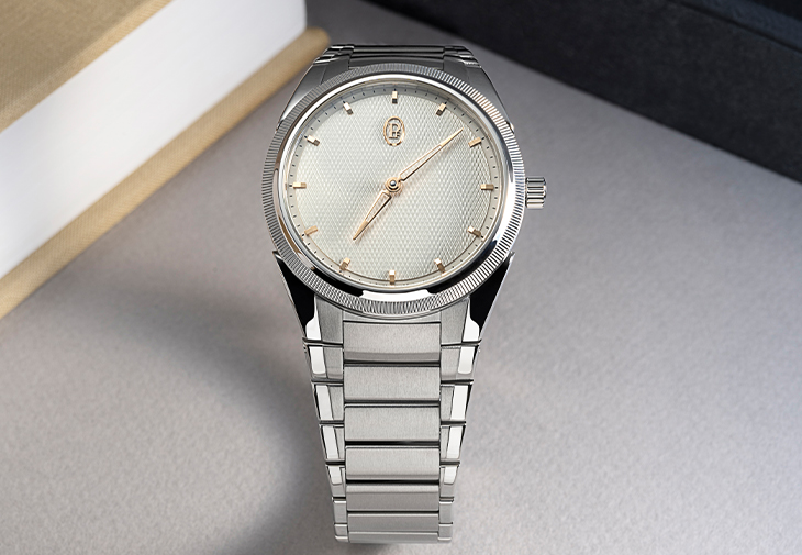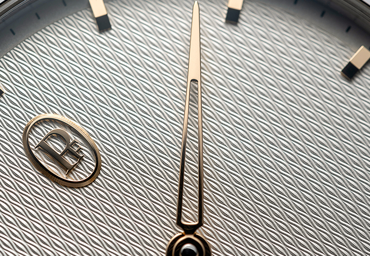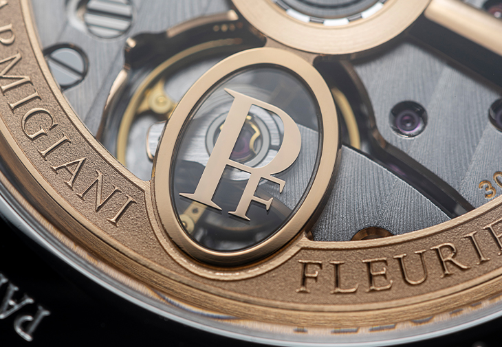 品牌標識位於面盤 12 點鐘位置,「PF」字樣清晰顯示在垂直橢圓形外圈當中,字母和外圈邊緣都經過了充分而細緻的雙側倒角打磨,最終以立體鑲嵌優雅呈現。帕瑪強尼精湛的工藝確保了面盤上璣鏤紋理的尺寸恰到好處,紋理過小則肉眼無法識別,過大則會破壞整體的和諧之美。正是這種恰如其分的比例,成就了腕錶優雅內斂的氣質、獨一無二的專屬格調,以及歷久彌新的現代風範。