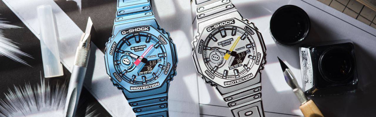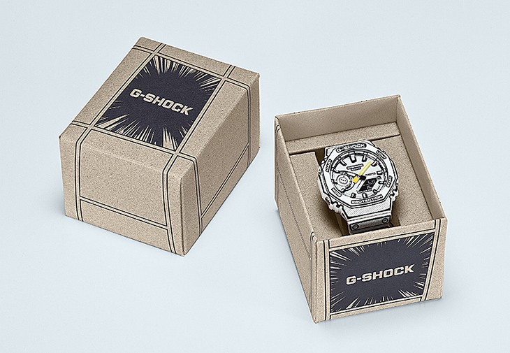 日本製造的GA-2100MNG系列以經典八角錶殼的2100為基礎型號,採用碳纖維樹脂錶殼搭配生質樹脂錶帶。錶款的整體外觀應用線條與陰影創造2D視覺效果,並採用漫畫家常用的網點技術,營造出漫畫特有的情境感。細節部分更是添加眾多俏皮的巧思,錶盤9點鐘位的小指針被設計成漫畫中對話泡泡的模樣,而背蓋也刻印上日文片假名「ドンッ」(咚)的字樣,象徵日本漫畫中經典的擬聲詞,如此充滿漫畫風格設計也延續到了錶款的外盒包裝,GA-2100MNG是一款世界中熱愛日本漫畫粉絲們都不容錯過的錶款。