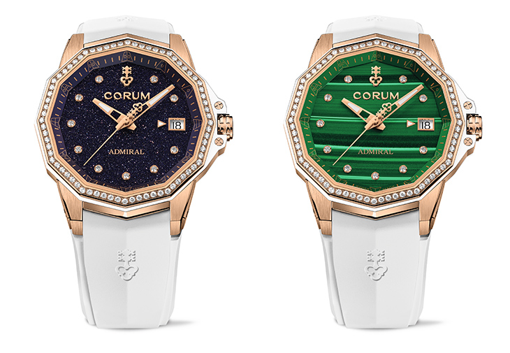 此外,適合女性佩戴的Admiral 38系列則新增孔雀石與藍色砂金石錶盤款式,搭配18K玫瑰金12邊形錶殼。孔雀石為古老的玉料,因內部有含銅礦的化合物而顯現出如孔雀羽毛般鮮豔的綠色,表面呈現色彩濃郁的條狀花紋,流露出高貴氣息;藍色砂金石則是17世紀義大利威尼斯慕拉諾島上,工匠製作玻璃過程中的美麗意外,呈現出猶如繁星夜空般的浪漫情境。每只錶款的紋理均舉世無雙,錶圈鑲嵌72顆鑽石,時標亦鑲嵌10顆鑽石,更點綴出全新Admiral 38系列錶款的優雅奢華氣質。