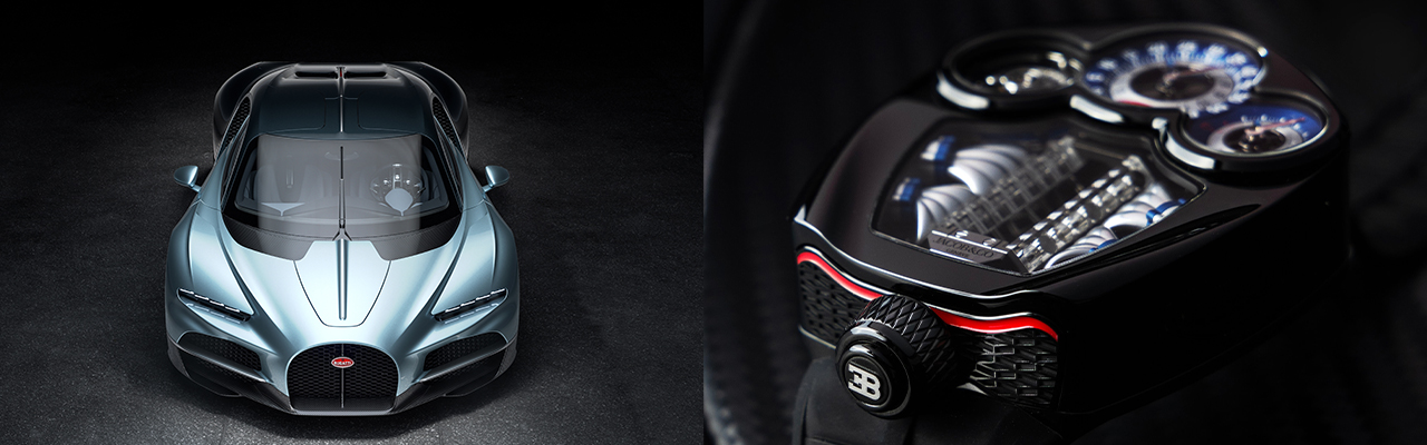 Jacob & Co. 與 Bugatti 共同發表的這款陀飛輪腕錶,不只以超級跑車為靈感,更體現了超跑 與頂級腕錶的整合設計,將 Bugatti 最新頂級車款 Tourbillon 的技術成就、複雜機械、流線 外觀,全面解構再詮釋,化為戴著走的超級引擎。這款非凡時計最醒目的特色,包括 V16 氣缸引擎自動裝置、30 秒一圈的飛行陀飛輪、雙重動力儲能顯示、造型仿自跑車轉速表 的逆跳小時與分鐘顯示,堪稱鐘錶界前所未見的原創設計。Bugatti 同時也從製錶業中汲取 靈感,設計出全新車款,展現品牌獨有的技術細節與精準工藝,正如同頂級腕錶一絲不苟 的複雜機芯,尊貴不凡,細緻入微,彰顯出 Bugatti Tourbillon 超級跑車的命名由來。