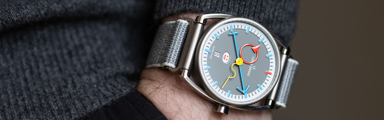 圓形的40毫米錶殼由噴砂處理的2級鈦金屬製作,側邊由兩組鏡面拋光的5級鈦金屬弧形桿固定,並延伸出去形成錶耳。自1990年代以來,6點位置的表情符號星期視窗就一直是 Alain Silberstein的招牌設計。整只腕錶以低調且充滿現代感的冷灰色為主要色調,一路從面盤延伸至錶帶。面盤上展示了由包浩斯風格取得靈感的三根指針,混合了基本三原色和大膽的幾何形狀:紅色三角形時針、藍色箭頭狀分針和黃色波浪秒針。錶冠有Silberstein的招牌紅色烤漆面裝飾。快拆尼龍錶帶還有魔鬼氈固定扣環設計,方便配戴者快速調整錶帶長度。