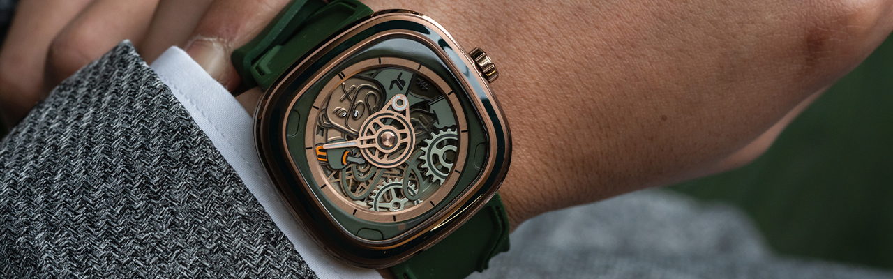 直觀T2/07的設計美學,如同欣賞一篇動人的寓言故事,錶殼用色也呼應面盤精湛的設計思維,品牌以咖啡金PVD,融合帶有黑色基底的深綠色,高調呈現SEVENFRIDAY不同尋常的設計思維,同時結合品牌識別度強烈的多層式異材質製殼工藝,展現叛逆創新設計之下,依舊秉持嚴謹製錶的品牌精神。