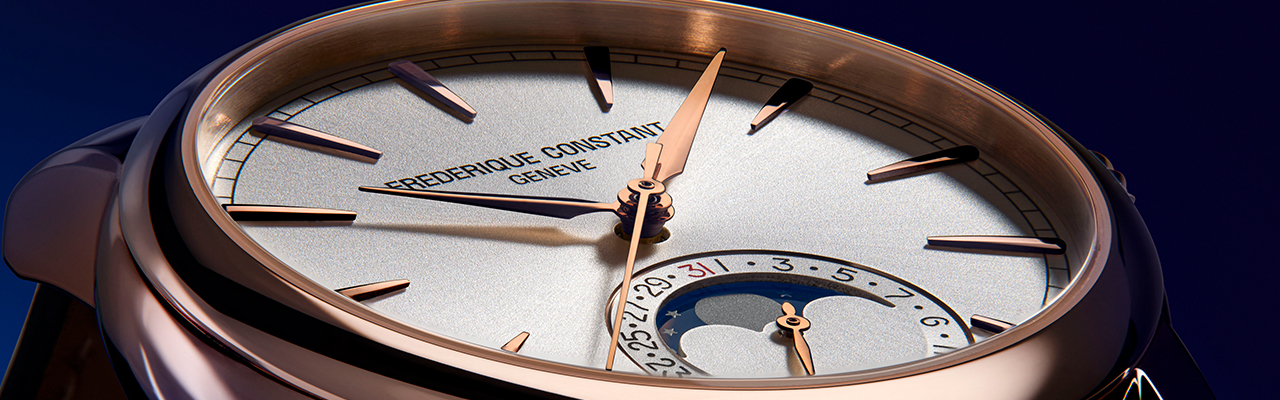 然而,日期與月相暗中相通。兩者都是天文學的產物。近三個世紀以來,製錶師一直認為兩者之間有著自然而然、不言而喻的關聯。這正是康斯登 (Frederique Constant) 今天所慶祝的,以高級製錶的傳統工藝向這一古老的傳統致敬。這兩項複雜功能緊密相連,盤繞在6點鐘位置的同一計時器內。這兩項功能顯示在以太陽紋精心裝飾的銀色錶盤上。環繞錶盤的是精緻的玫瑰金色時標,與單獨手工拋光的同色指針相得益彰。