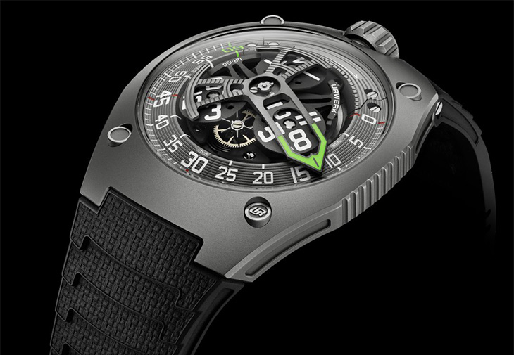錶盤上觸目的大型鏤空指針框著目前的小時數字,沿著弧形分鐘刻度滑行,至 60 分鐘的一刻,在百分之一秒之間回彈至0,同時所有衛星小時轉頭各自在軸上旋轉,指針則框著新的小時數字,展開下一個小時的旅程。