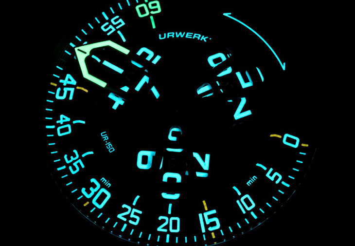 UR-150 的分鐘顯示範圍幅度擴大,從以往的 120 度變為 240 度,當中的關鍵是提升動能的效率。這逆跳系統是 URWERK 有史以來最具野心的研發,零件重量是有史以來最大,速度和慣性也是最大,所以必須研發創新技術來控制各種動力,即是在飛輪上安裝速度調節器,令指針回彈更加順暢,這類技術通常用於調節三問錶的鳴響順序。