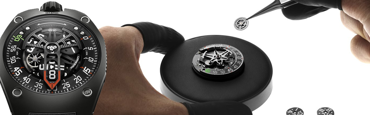 UR-150 的逆跳系統令人想起品牌之前另一款逆跳腕錶:一個凸輪規限著飛行卡羅素連三個小時衛星轉頭的推進,當指針走到綠色數字「60」,一條彈簧會閃電般觸發指針回彈240度,而衛星轉頭同時旋轉270度。Felix Baumgartner 解釋說:「這像完美排列的星宿,又像一場完美風暴。為確保衛星小時、大指針及各零件在正確時間跳躍,我們設計了全新的衛星小時系統,在衛星系統及底部機芯之間安裝一個飛輪和小齒輪,在凸輪引導下操作。這凸輪和齒條系統取代了馬耳他十字為基礎的“經典”結構,為此我們要在自己的工作室研製一種非常特殊的彈簧,同時將60 和 0分鐘之間的距離加一倍,令指針瞬間回彈的動態更加明顯搶眼。」