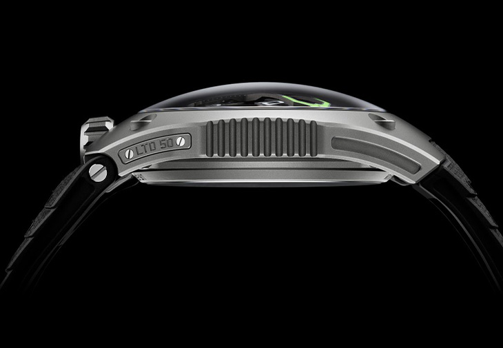 從側面看,錶殼、錶鏡和錶帶連成一條順滑曲線,符合人體工學貼合手腕。弧度由錶殼延伸到機芯,衛星小時轉頭和大指針亦有相同弧度。Martin Frei 續說:「戴著 UR-150 ,無需扭動手腕已可看到時間,當下時間一目了然,關鍵在於細節與定位佈局。錶殼的柔和線條與機械強勁運作之間的張力令 UR-150散發力量與動感。我對和諧不感興趣,我堅信美是從對比張力之中呈現出來。」
