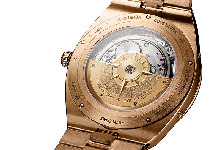 透明底蓋可見內裝的1120 QP/1自動上鍊機芯,這是江詩丹頓重要的超薄萬年曆機芯,脈絡可以上推到1967年江詩丹頓、愛彼、百達翡麗共同設計,並委由積家生產製作的Cal.920。江詩丹頓以此為基礎發展出1120超薄機芯(其他參與品牌也各有發展),而1120 QP便是以此為基礎再加上萬年曆模組。直徑29.6mm,厚4.05mm,不只用於男錶,專為女性推出的Traditionnelle超薄萬年曆腕錶也搭配此枚機芯,顯見其表現獲得好評。透明底蓋可見機芯搭配風向玫瑰造型的22K金自動盤,這是Overseas系列的特色裝配,象徵系列旅行探索精神。