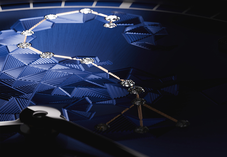 雕花完成之後,才是切割出陀飛輪視窗。主要雕刻工作完成後,才能為面盤塗上藍色塗層,並以機器工具鏤刻,以粉紅金底色串連星座的精緻線條,並在塗覆清漆保護層。最後才是轉印軌道紋刻度、品牌名稱、貼附立體時標、馬爾他十字標誌,以及鑲鑽等相對單純的收尾工作。