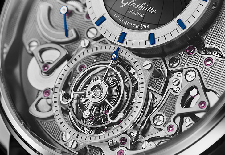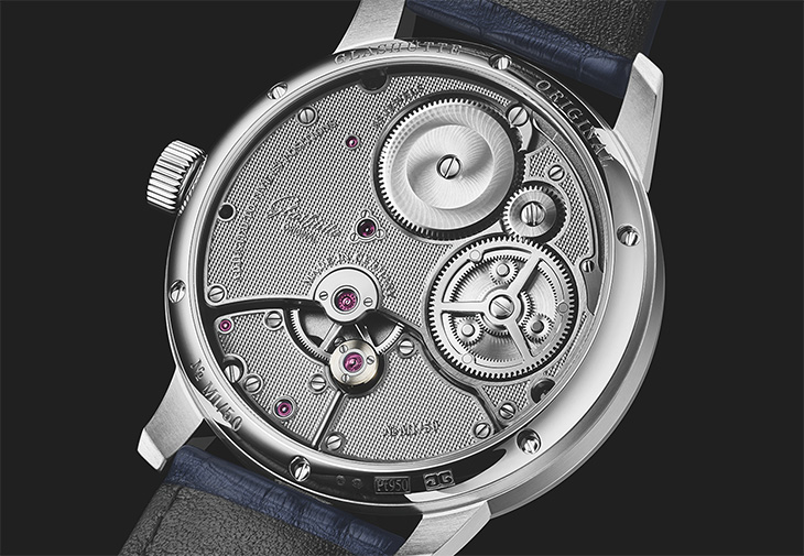 錶款重點之一是6點位置的飛行陀飛輪,飛行陀飛輪的發明者是畢業於德國格拉蘇蒂製錶學校的製錶大師阿爾弗德・海威格(Alfred Helwig, 1886-1974)於1920年代所完成,移除陀飛輪橋板,改由底部固定架構,強化賞玩美感的結構理論至今依然通用,並被不少高端品牌採用。而格拉蘇蒂原創則在此基礎上更上一層,加入少見的停秒歸零機制以及分鐘分離機制兩項專利機制。陀飛輪最初發展的目的是為了讓時計能運行得更加穩定,而停秒歸零與分鐘分離則能讓時間調校能更精準,彼此之間有些前因後果的關聯。只是或許是陀飛輪結構精密,因此一直以來鮮少有人將這幾項整合為一。有推出陀飛輪加停秒的品牌已經少見,再加上秒針歸零,除了他們之外,目前已知也只有朗格做到這地步。而格拉蘇蒂原創還加了一個分針分離機制,技術難度當然又更複雜。
